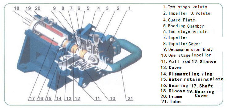 The structure design of two-stage impeller adopts double pump body, which solves the shortcomings of single impeller pump such as excessive vibration and noise, flat performance curve, narrow impeller passage and poor performance in the initial stage of feeding. It is very suitable to meet the requirements of high-flow, low-pressure feeding and low-flow, high-pressure filtering when the pressure filter feeds.