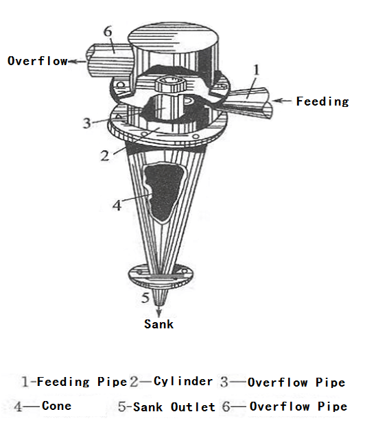 When the mixed liquid to be separated enters the hydrocyclone at a certain pressure from the feed port of the hydrocyclone, a strong three-dimensional elliptical strong rotational shear turbulence is generated. Due to the different density of particles, the centrifugal force, centripetal buoyancy, fluid drag force and other sizes are different. Under centrifugal sedimentation, most of the coarse particles (or heavy phases) are discharged through the underflow port of the cyclone, while most of the fine particles (or light phases) are discharged by the overflow pipe, thus achieving the purpose of separation and classification.